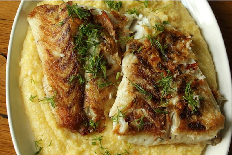The grits can be served on a platter with the fish on top or in a separate bowl. Garnish with a little fresh parsley or dill. Serve with a plate of sliced tomatoes sprinkled with salt and pepper.
