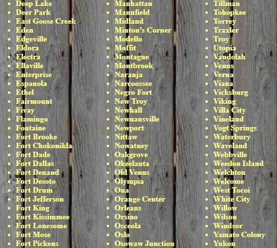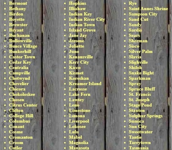 Acron, Aladdin City, Allenhurst, Andytown, Balm, Basinger, Campville, Capps, Eldora, Electra, Fort Chokonikla, Fort Dade, Fort Drum, Hampton Springs, Hilolo, Holopaw, Kerr City, Kismet, Liverpool, Manasota, Maytown, Merritt Island (many towns), Muscogee, Old Venus, Oslo, Otahite, Picolata, Pine Level, Punta Rassa, Rollestown, Tocoi, Vineland, Wacahoota, Yukon, Zion
