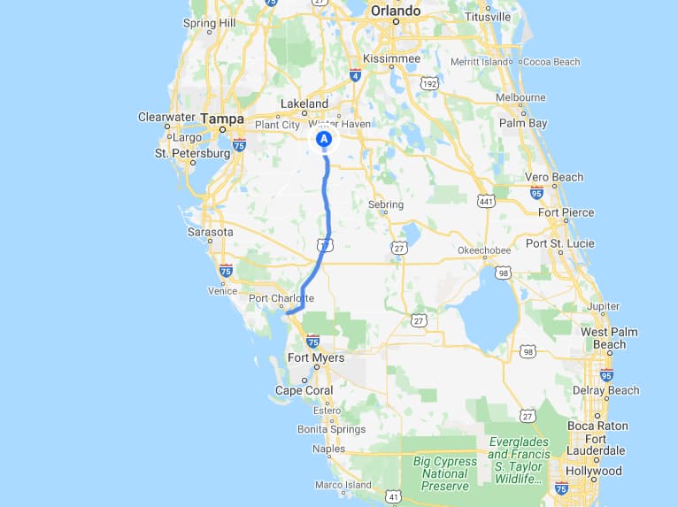 Some towns along the way are Fort Meade, Bowling Green, Wauchula, Zolfo Springs, Arcadia, and Fort Ogden.