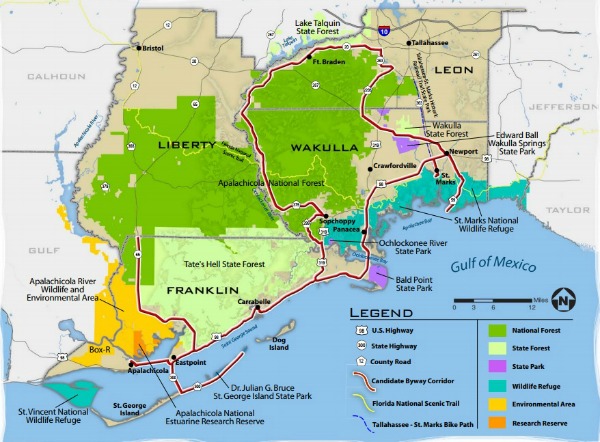 An official Florida Scenic Highway, the Big Bend Scenic Byway begins on the west at Apalachicola and extends along the coast to St Marks at its eastern limit. The route meanders through Franklin, Liberty, Wakulla, and Leon Counties as shown on the official route map above.