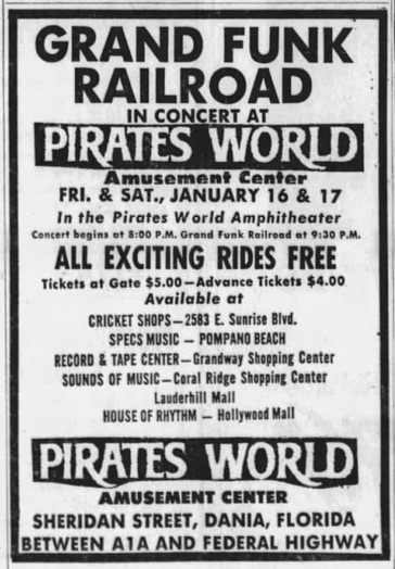 Pirates World was more than a tourist attraction: it was a theme park and they also had musical entertainment from the sixties and seventies. It was located off Dania Beach Boulevard.