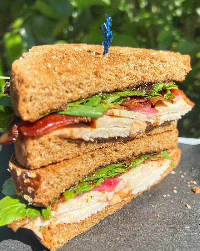 Most folks also enjoy the Classic Yellow Dog Club, another sweet and spicy combination with turkey, smoked Gouda cheese, applewood smoked bacon, lettuce and cucumber on multi-grain bread.
